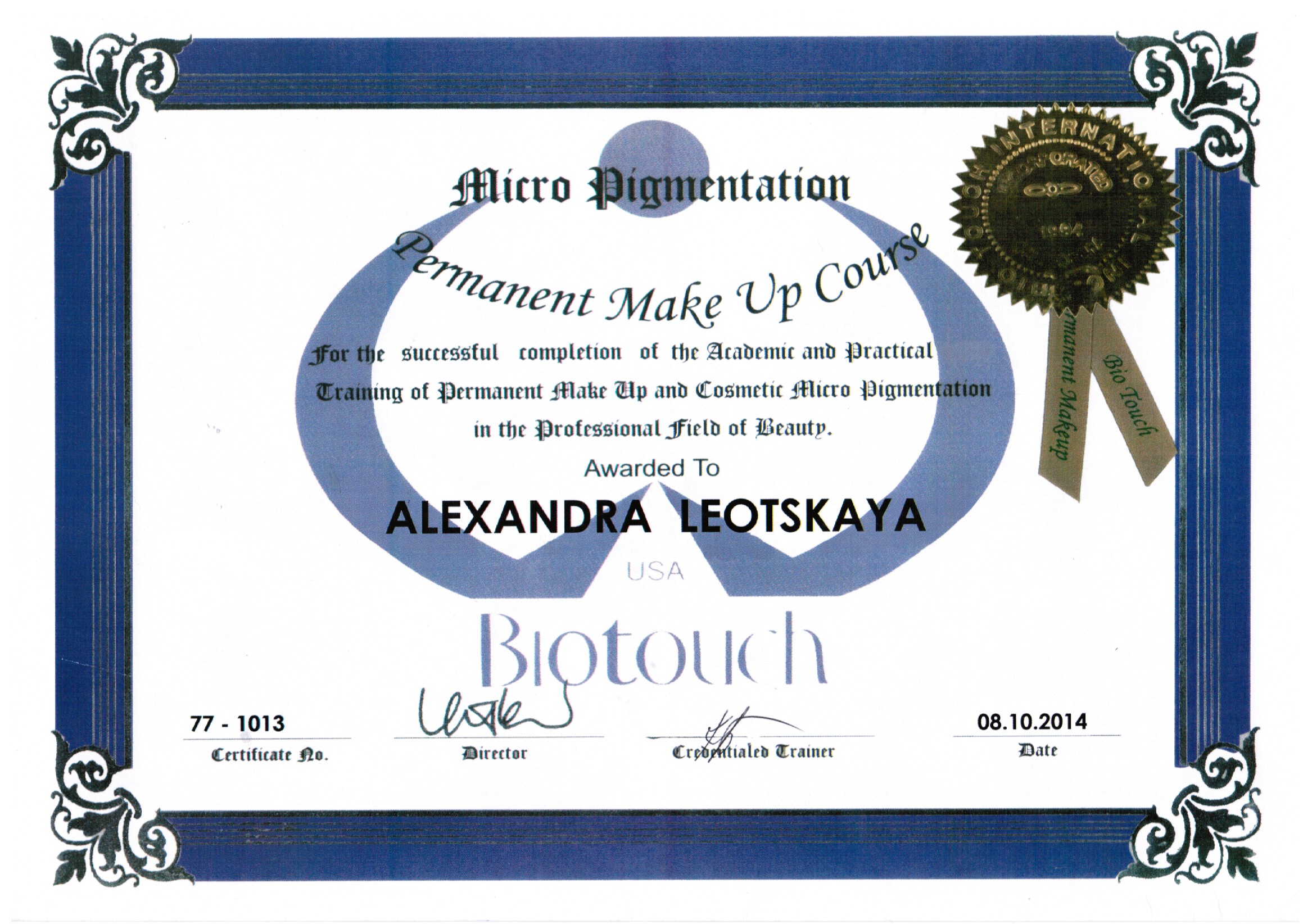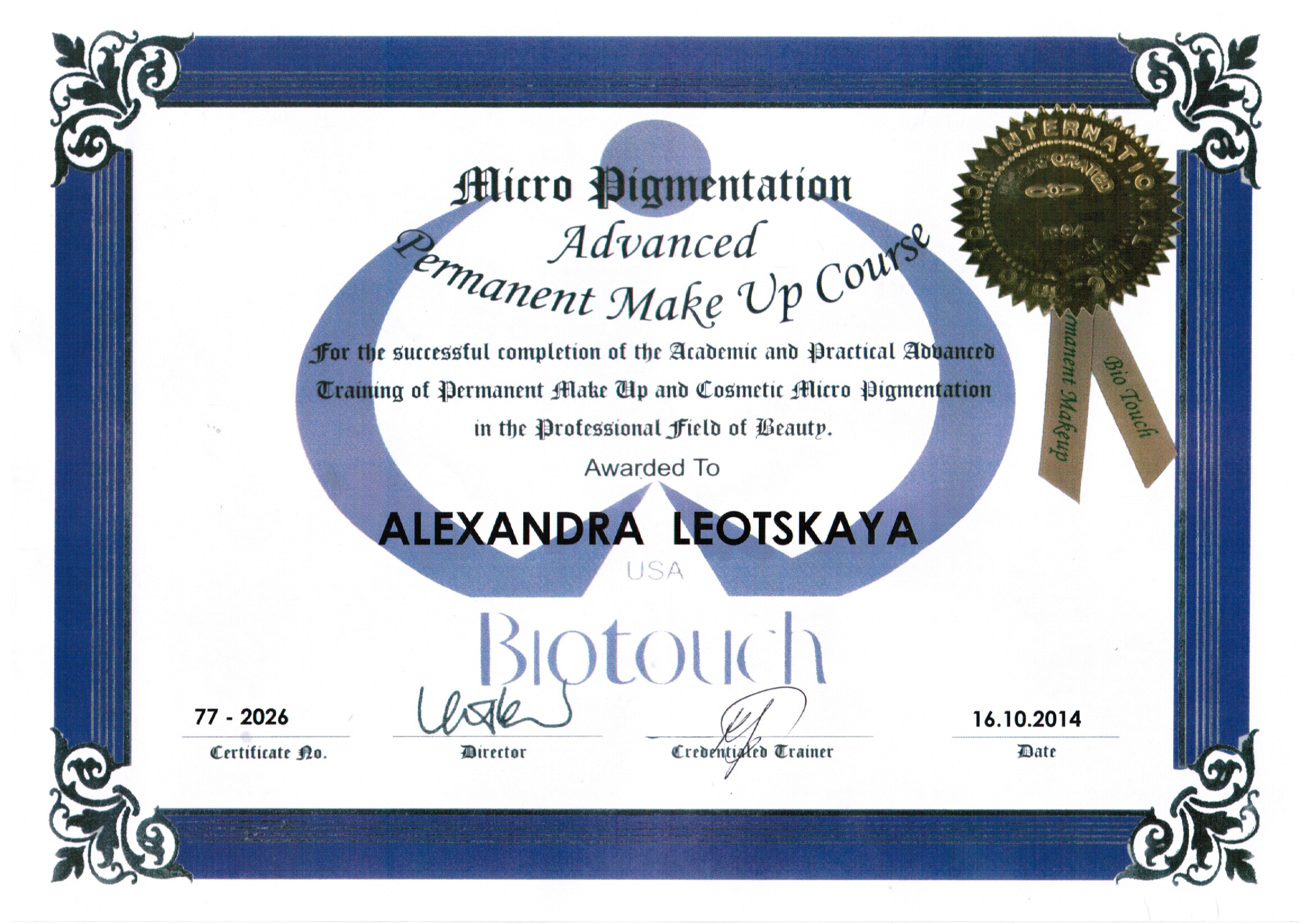 Мастер - Александра Леоцкая с 15 летним стажем работы в индустрии красоты, является дипломированным специалистом в области перманентного татуажа и микропигментирования, имеет сертификаты европейского образца.