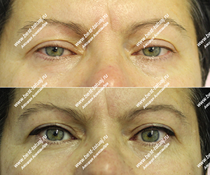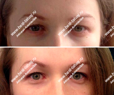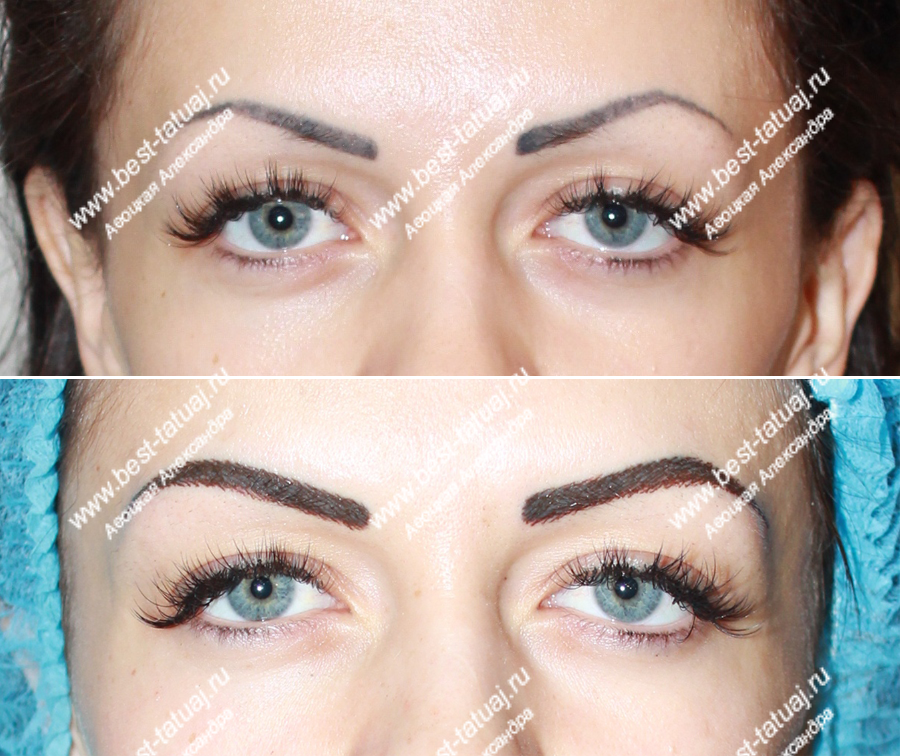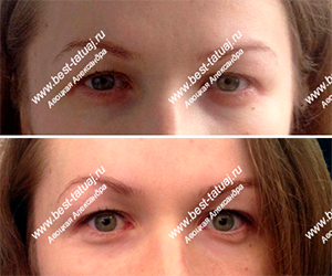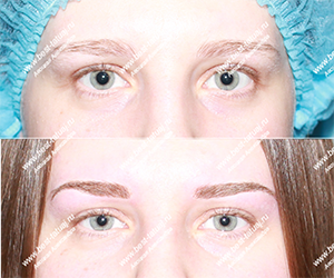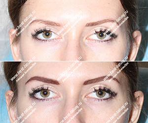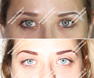 - Процедура может продолжаться 40-60 минут в зависимости от объема и сложности работы. После нее может возникнуть незначительное покраснение и припухлость в области бровей. Последствия полностью исчезают через 2-3 дня.