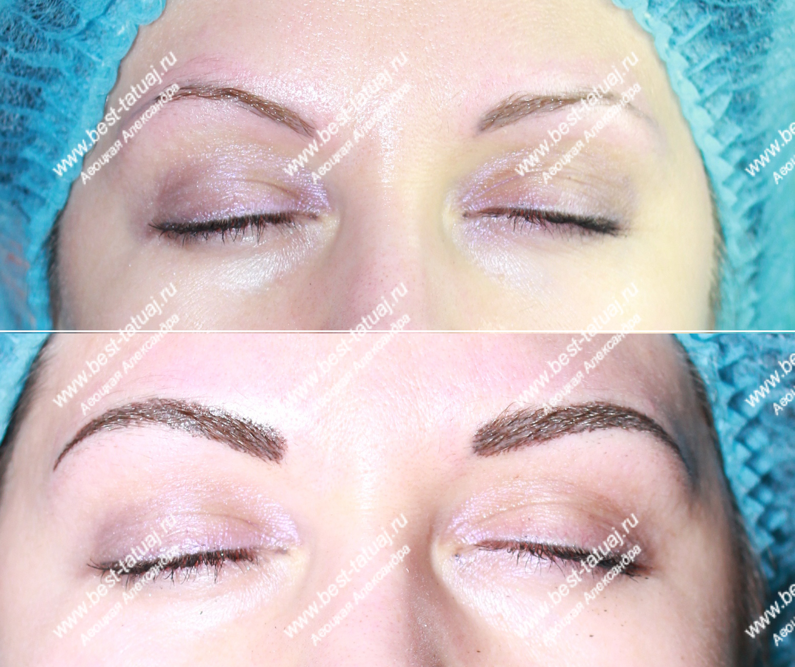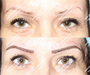 - При помощи одноразовых иголочек и машинки для татуажа прорисовывается каждый волосок брови и под кожу вводится краситель. Часто используется последовательно несколько тонов краски для получения эффекта натуральности.